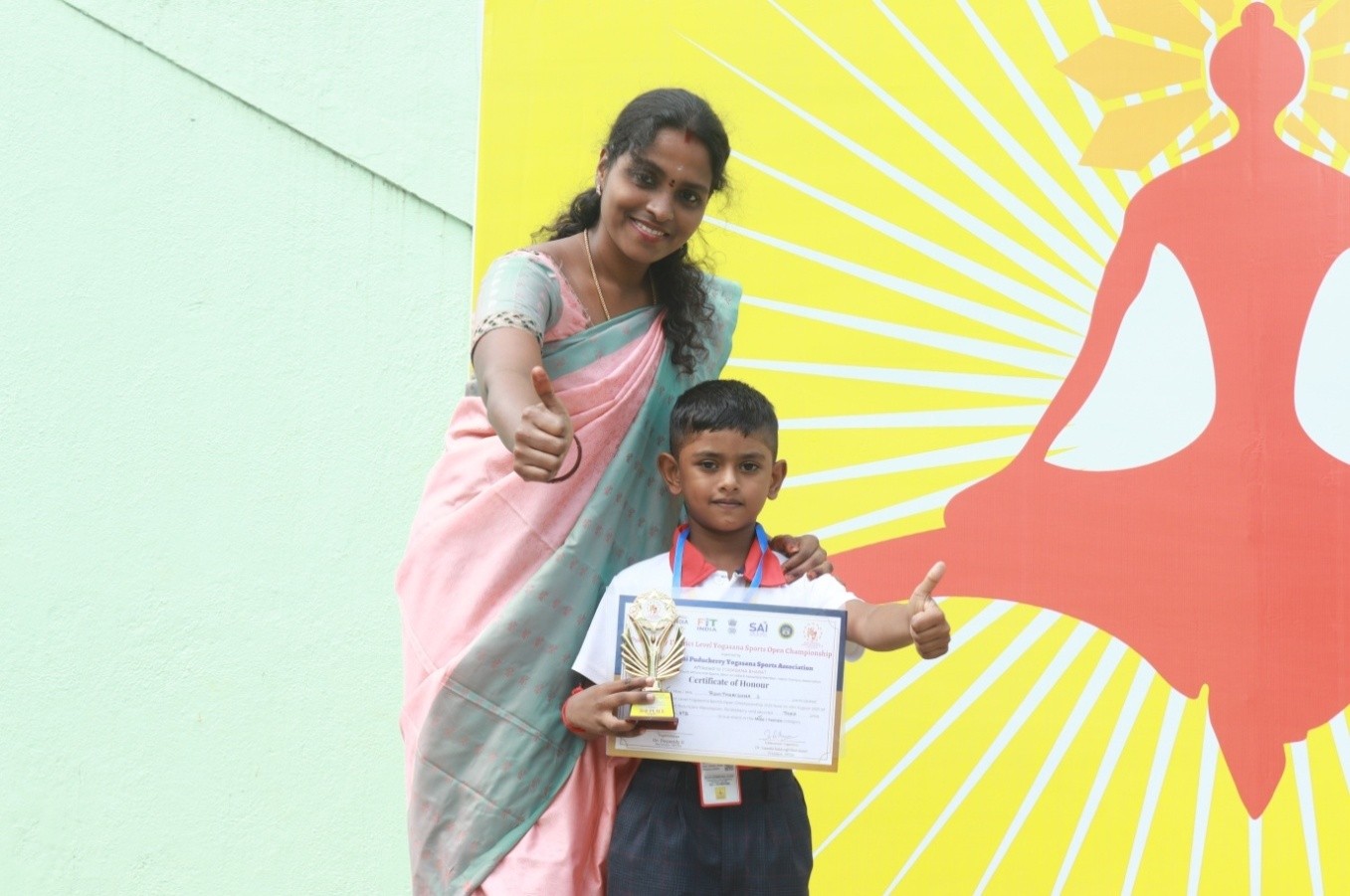 Our Aklavya student Raja Rohithkrishna S participated in the 1 STD Group event in the Male category and secured a Third prize. The Puducherry District Level Yogasana Sports Open Championship 2025 was organised by Siddharboomi Puducherry Yogasana Sports Association, affiliated to YOGASANA BHARAT. The event was held on 10th August 2025 at Shree Raja Rajeshwari Thirumana Mandapam, Pondicherry.